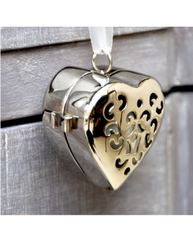 Un petit coeur en métal argenté orné d'un ruban liberty (la couleur du ruban peut varier) dans lequel se love un parfum solide le tout...