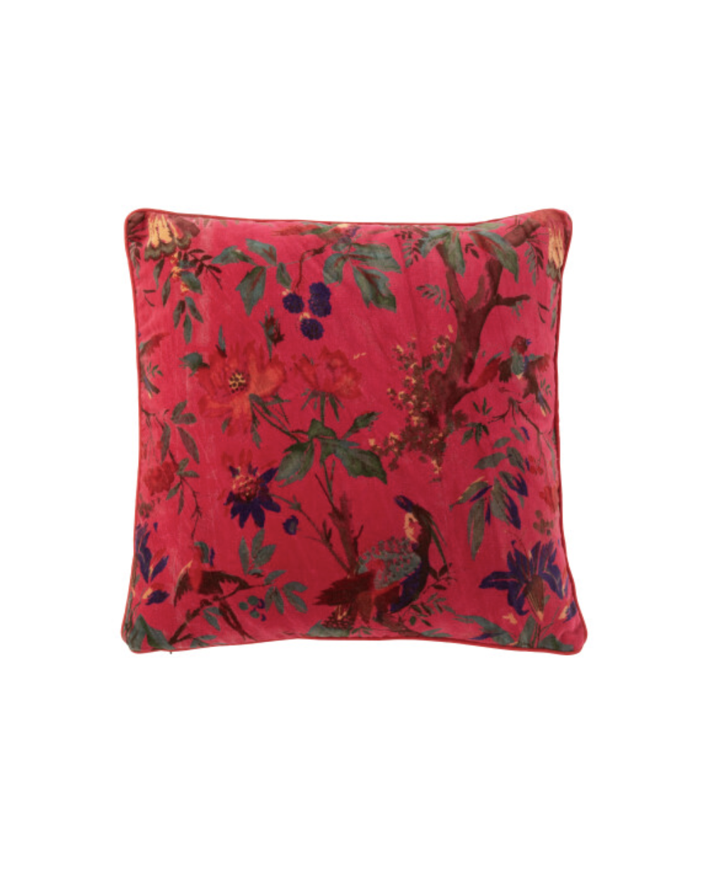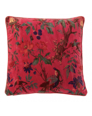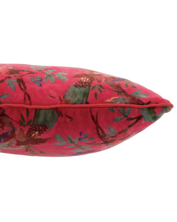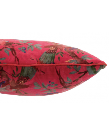 Coussin en velours de coton rose. Imprimé floral et oiseaux