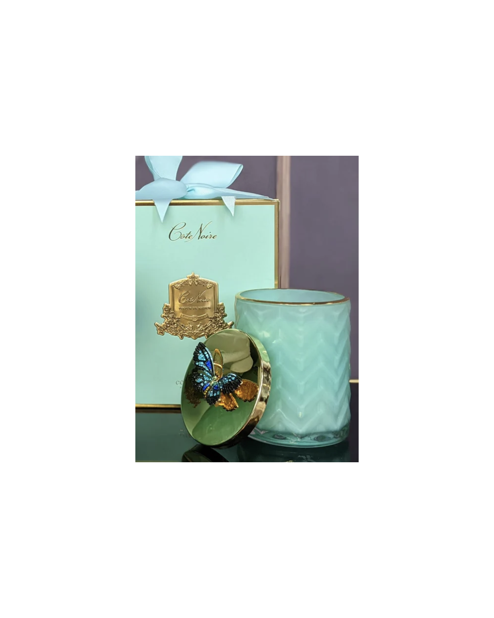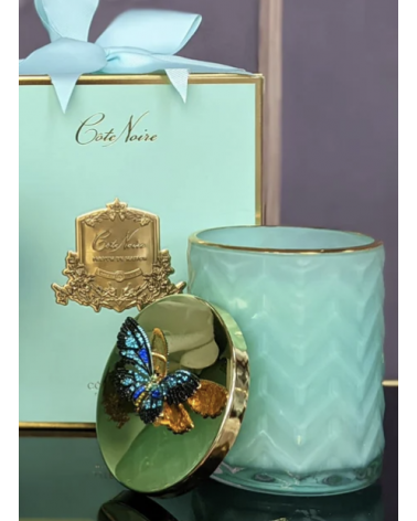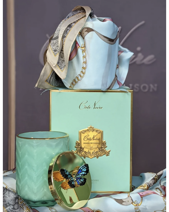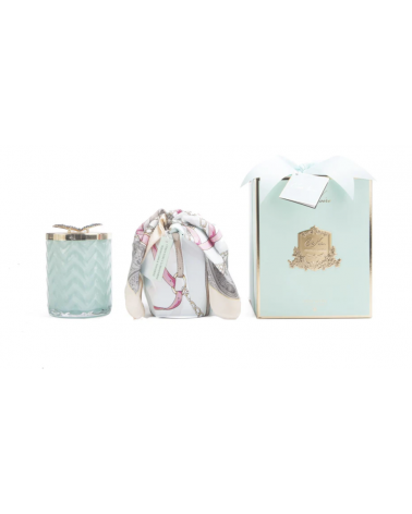 La bougie en édition limitée avec verre à chevrons est livrée dans une boîte cadeau avec un foulard en soie.